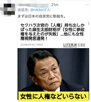 不過,有些日本網友在看到《日本經濟新聞》推文題為“首相輔佐官中谷:‘應探討是否通過’侵犯人權制裁法案”的報道後想到了日本自民黨和美國。有網友評論稱,“那最先被制裁的應是自民黨”,並貼出了自民黨“大佬”麻生太郎“賦予女性參政權真是失敗”等歧視女性言論相關報道。