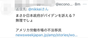 此外,也有網友諷刺:“沒想到日本還想指控拜登?沒戲。”還貼出了美媒《新聞週刊》日語版有關美國勞動市場中的非法移民的報道。