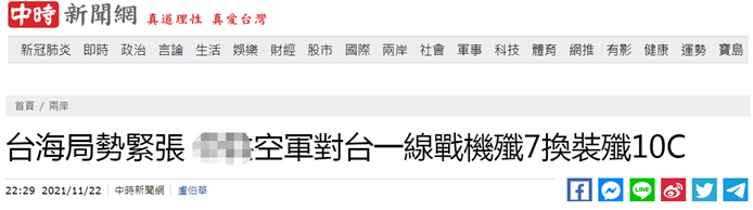 “中時新聞網”提到,當前美中關係緊張,台海局勢亦隨之緊繃,一年多來大陸持續派遣軍機進入台灣西南“防空識別區”,今年以來進入“防識區”“滋擾”次數已達800次,軍機數單日最高將近百架。大陸官方稱,這是針對台灣當局“倚美謀獨”的圖謀和美方一些人“以台製華”動向所採取的措施,目的在向全球表達“世界上只有一箇中國,台灣是中國的一部分”的堅定立場。
