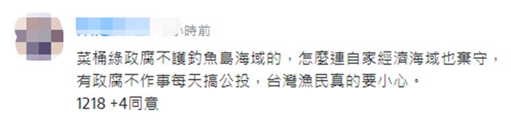 有網友聽聞此事後批評民進黨當局,不護釣魚島海域的,怎麼連自家經濟海域也棄守,“政府”不做事每天搞“公投”,台灣漁民真的要小心。
