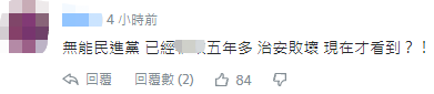 有網友發表相同觀點,“現在才看到治安敗壞?瞎了嗎?‘政府’的末梢神經已經壞死了!”↓