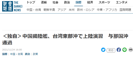 日本右翼媒體《產經新聞》24日援引日本防衞省和台灣當局相關人士的話聲稱,中國兩艘071型船塢登陸艦在11月中旬穿過台灣與位於日本最西端的與那國島之間海域後向南行駛,駛向台灣東部花蓮附近海域,並在該海域停留一段時間,實施了所謂為“登陸作戰”做準備的演習。報道還稱,日本防衞省綜合幕僚監部沒有公佈此消息,未能瞭解到中國登陸艦實施演習的詳細情報。