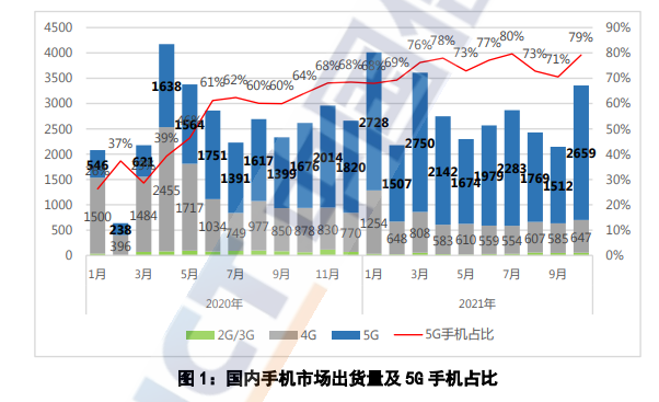 從國內手機市場總體情況來看,2021年10月,國內手機市場出貨量3357.5萬部,同比增長28.4%,其中,5G手機出貨量2659.0萬部,同比增長58.7%,佔同期手機出貨量的79.2%。2021年1-10月,國內手機市場總體出貨量累計2.82億部,同比增長12.0%,其中,5G手機出貨量2.10億部,同比增長68.8%,佔同期手機出貨量的74.5%。
