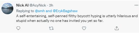 有網友提醒澳大利亞政府還並未受到北京方面的邀請,嘲諷道:“當實際上還沒任何人邀請你的時候,(這就是)一種自我娛樂式、骯髒的抵制宣傳手段,非常搞笑和愚蠢。”↓