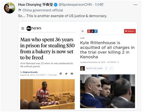 對比兩起美利堅罪案,華春瑩發推諷刺:“這就是美國正義與民主的另一例證”!