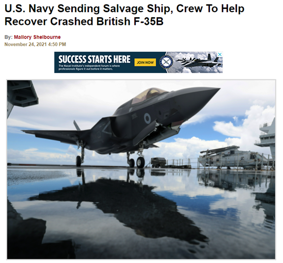 【環球網報道 記者 張海潮】據美國海軍學會(USNI)網站11月24日報道,英國政府發言人證實,美國海軍正在派遣一艘打撈船及其船員幫助英軍打撈17日墜入地中海的F-35B隱身戰鬥機。另有消息顯示,意大利也在協助打撈,但事發已整整一個星期,該機至今仍未找到。從報道的情況看,美國的救援力量現在還未到位。