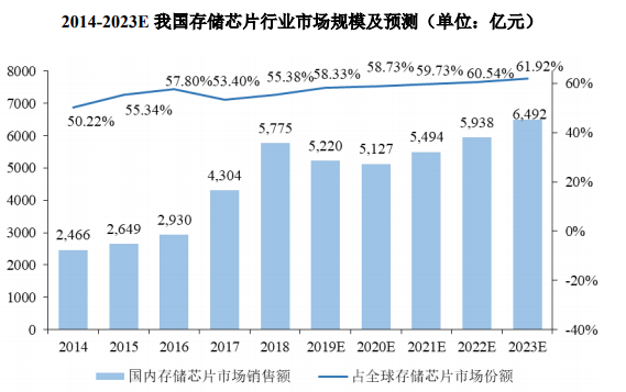 在國內市場,隨着中國在電子製造領域水平的不斷提升,國內存儲芯片產品的需求量逐步攀升。根據世界半導體貿易統計協會數據,2018年我國存儲芯片市場規模為5775億元,同比增長34.18%,預計2023 年市場規模將達6492億元。