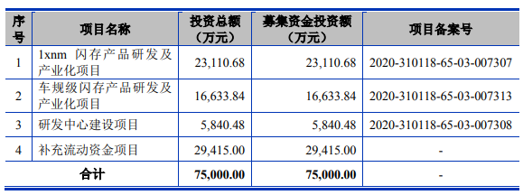 招股説明書顯示,此次IPO,東芯半導體計劃募資7.5億元,其中,2.31億元用於1xnm閃存產品研發及產業化項目,1.66億元用於車規級閃存產品研發及產業化項目,5840.48萬元用於研發中心建設項目,2.94億元用於補充流動資金項目。具體募投項目情況如下: