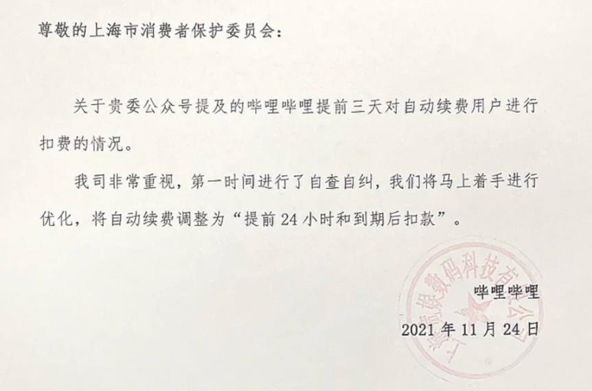 *【環球網科技綜合報道】*11月25日消息,針對上海消保委關於B站“自動續費提前三天扣款”的相關問題,B站官方日前回應稱,將第一時間進行自查自糾。