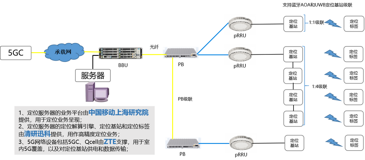 近日,中國移動研究院、中國移動上海產業研究院、中國移動雲南公司和中興通訊、清研訊科共同完成了業界首個5G+UWB多維高精度定位方案的商用驗證。本方案將UWB定位基站與5G基站融合部署,充分複用5G基站的供電資源、傳輸資源;同時結合MEC邊緣計算、大數據等領先技術,將定位軟件部署在本地服務器,呈現了基於位置的電子圍欄、突發情況報警等高精度定位服務。該方案不僅可實現室內亞米級高精度定位,其即插即用的部署方式可大幅降低工程施工和改造成本,並可實現垂直行業多網合一的需求,助力各行各業的數字化轉型。