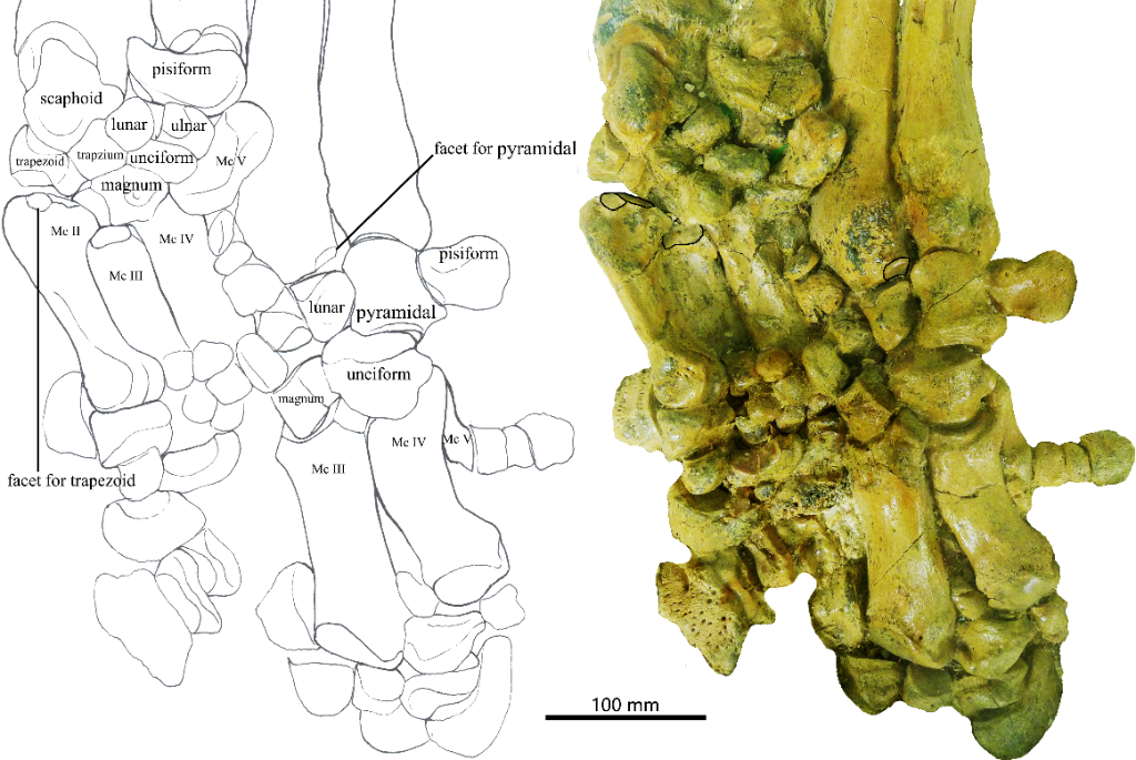 山東山旺盆地發現的並角犀腳骨化石 (中科院古脊椎所供圖)