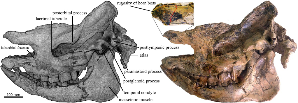 山東山旺盆地發現的並角犀頭骨化石 (中科院古脊椎所供圖)