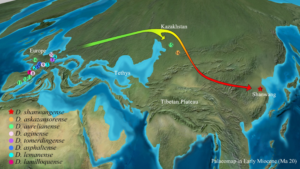 晚漸新世到早中新世並角犀屬在歐亞大陸的分佈和可能的遷移路線。(中科院古脊椎所供圖)