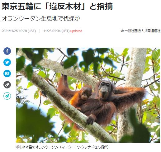 報道稱,總部位於美國的環保組織“雨林行動網絡”(RAN),通過分析人造衞星的數據發現,2020年東京奧運會和殘奧會場館建設中,使用的一部分木材,可能是從含有瀕危物種紅猩猩棲息地的熱帶森林中砍伐的。
