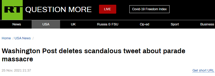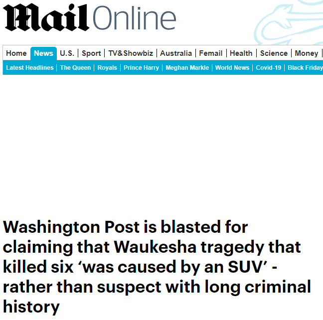 美國威斯康星州沃基肖縣日前發生惡劣事件,達雷爾•布魯克斯駕駛SUV衝進聖誕假日巡遊隊伍致6人死亡、61人受傷。不過,一家主流美媒——《華盛頓郵報》似乎有意規避在報道中提到兇手,甚至在布魯克斯已被指控多項一級故意殺人罪的報道中聲稱“悲劇是由一輛SUV造成的”,被俄媒和英媒“看了笑話”。