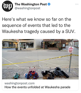 據“今日俄羅斯”(RT)25日報道,《華盛頓郵報》當地時間24日發佈了一條題為"以下是我們目前所知道的關於導致沃基肖悲劇的一系列事件,是由一輛SUV造成的"的推文,並附上了報道連接。報道文章同樣將造成6人死亡、61人受傷的惡劣事件歸咎於車輛,聲稱是"SUV衝撞了巡遊參與者"。