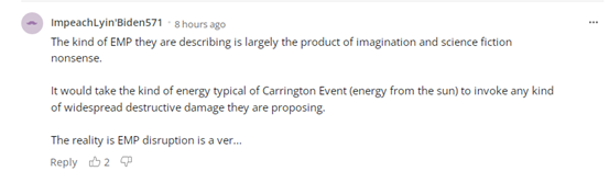 對於這種誇張的説法,有網友表示,“他們所描述的電磁脈衝(武器)在很大程度上是來自想象力和科學幻想式的胡言亂語。 這將需要‘卡林頓事件’的能量(來自強大的太陽風暴能量)才能造成他們提到的大範圍破壞……”