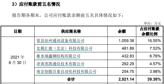 但與此同時,國能日新披露截止到2021年上半年末對“南京創能百泰自動化科技有限公司”應付款項餘額為254.75萬元,這還略高於2021年上半年向該供應商採購金額227.52萬元,這也就意味着截止到2021年上半年末,國能日新並未實際向該供應商結算採購款項,這也與招股書披露的“先款後貨”結算方式存在矛盾。