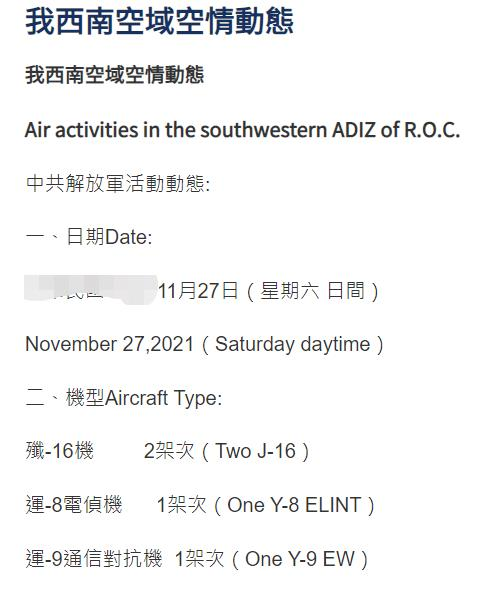 圖為台防務部門發佈的27日當天解放軍巡航軍機統計。