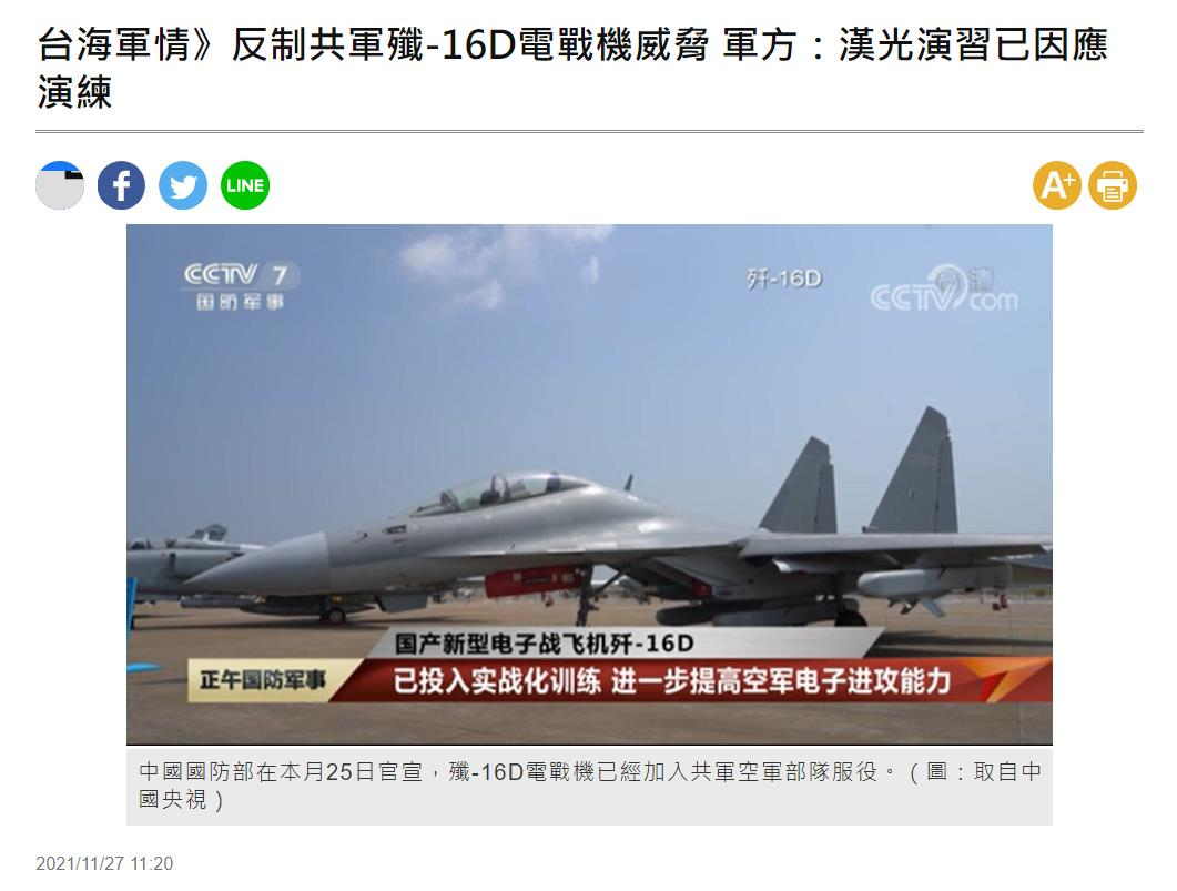 台灣《自由時報》27日宣稱,為了“反制共軍殲-16D電戰機威脅 台軍方:漢光演習已因應演練”。看到這個説法,老劉第一反應是台軍真的在漢光中演練了嗎?那為什麼台軍方要在這個時刻宣佈反制殲-16D的演練情況呢?難道近期警巡台海的殲-16中已經有“16弟”了嗎?