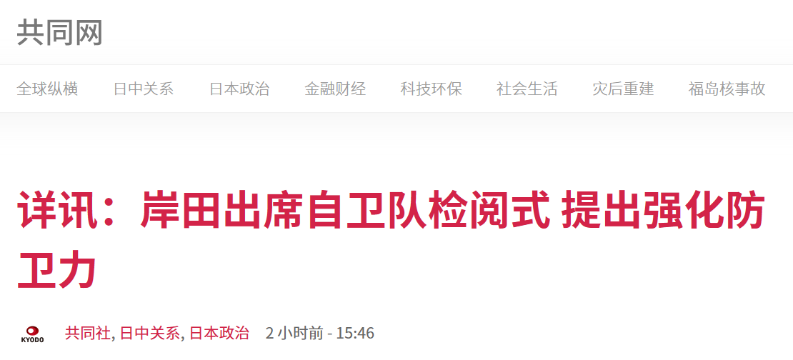 據共同社報道,岸田文雄27日在陸上自衞隊朝霞駐地發表講話時宣稱,考慮到日本週邊安全環境急劇變化的現狀,日本將強化必要的防衞力。岸田稱,在修改日本外交安全政策長期指針《國家安全保障戰略》、《防衞計劃大綱》和《中期防衞力整備計劃》過程中,“不會排除擁有對敵基地攻擊能力等一切選項”。除此之外,岸田還點名中國和朝鮮。他聲稱“不能忽視近來有關朝鮮彈道導彈新技術的開發和提高”。對於中國,岸田稱:“在缺乏充分透明度的情況下強化軍力,並持續試圖單方面改變現狀。”