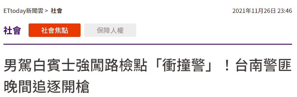 台媒爆台南警匪追逐戰:有人開奔馳強闖路障,警察開12槍追捕
