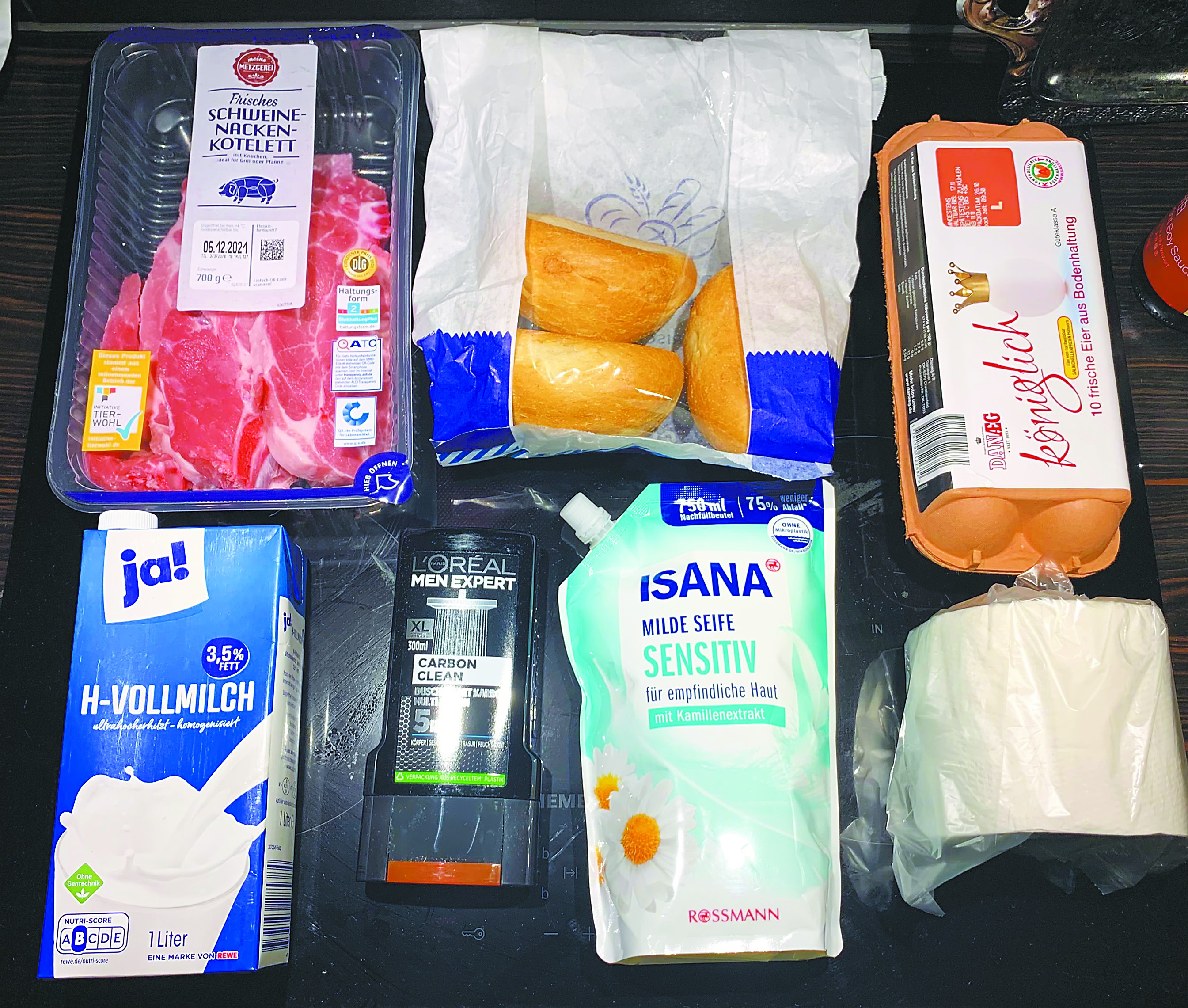 記者購買的7件物品價格分別是:雞蛋一盒(10個)1.59歐元;一升牛奶1.29歐元;豬肉一盒(500克)3.10歐元;3個小麪包共0.78歐元;1瓶500毫升普通洗髮水2.49歐元;750毫升洗手液0.75歐元;一卷衞生紙0.79歐元。上述物品總價為10.79歐元(約合77.66元人民幣)。