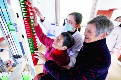 在某居家養老服務中心,醫生在指導老人進行康復訓練。解琛攝/光明圖片
