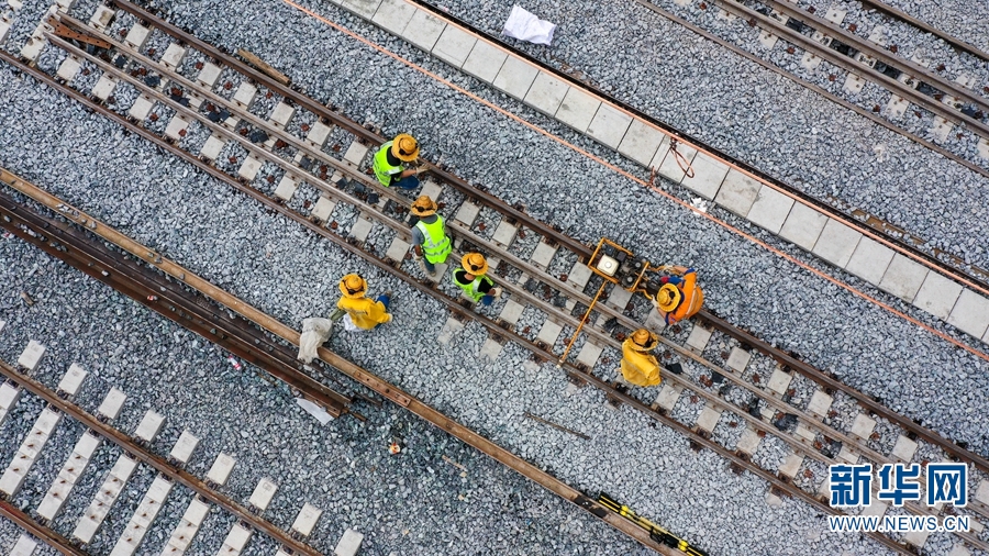 中老鐵路勐松二號隧道附近,鐵路建設者正在進行軌道精調(攝於10月27日)。(新華網 趙普凡 攝)