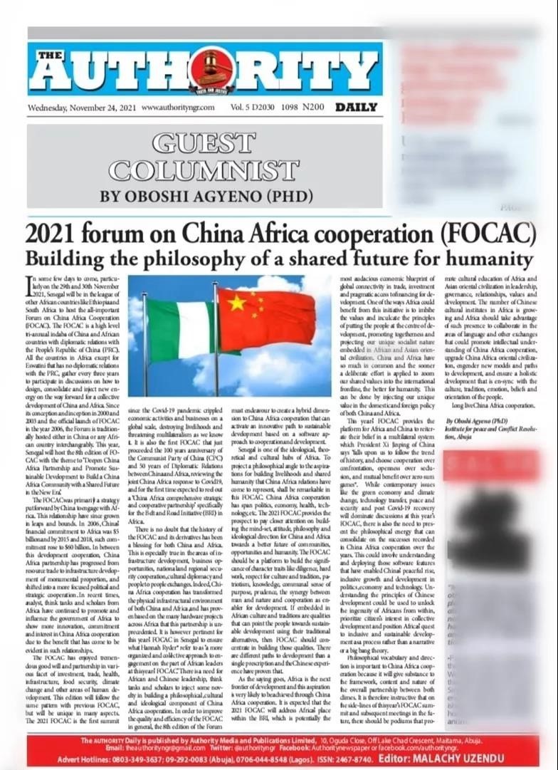 △尼日利亞《權威報》24日發表尼日利亞和平與衝突解決研究所博士奧格耶諾的評論,題為《2021中非合作論壇:構建人類命運共同體理念》。