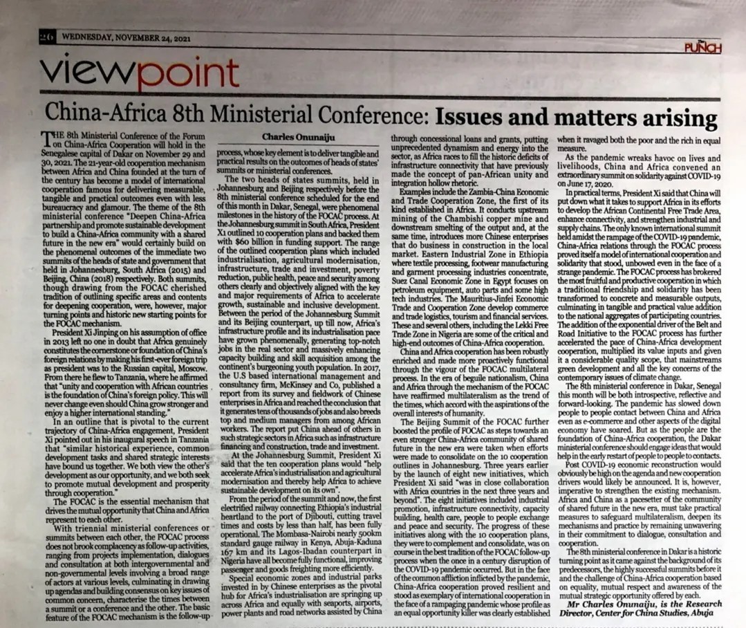 △尼日利亞《抨擊報》24日發表尼日利亞中國研究中心主任奧努奈居的評論,題為《中非合作論壇第八屆部長級會議:承前啓後》。