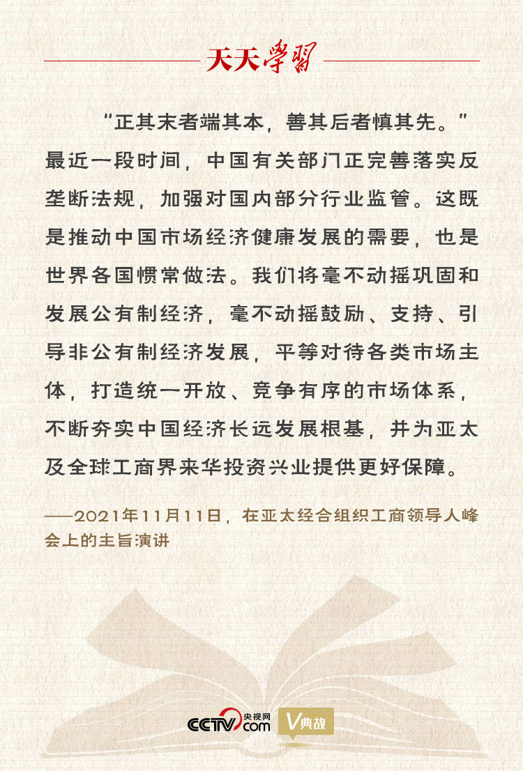 11月11日,習近平主席應邀在北京以視頻方式向亞太經合組織工商領導人峯會發表題為《堅持可持續發展 共建亞太命運共同體》的主旨演講。習近平指出,當前,新冠肺炎疫情仍在全球蔓延,世界經濟復甦艱難曲折。亞太地區應該勇擔時代責任,發揮引領作用,堅定朝着構建亞太命運共同體目標邁進。關於當前中國經濟發展形勢,習近平指出,最近一段時間,中國有關部門正完善落實反壟斷法規,加強對國內部分行業監管。他引用“正其末者端其本,善其後者慎其先”,旨在強調上述舉措是治本之策、先手之棋、破題之舉。