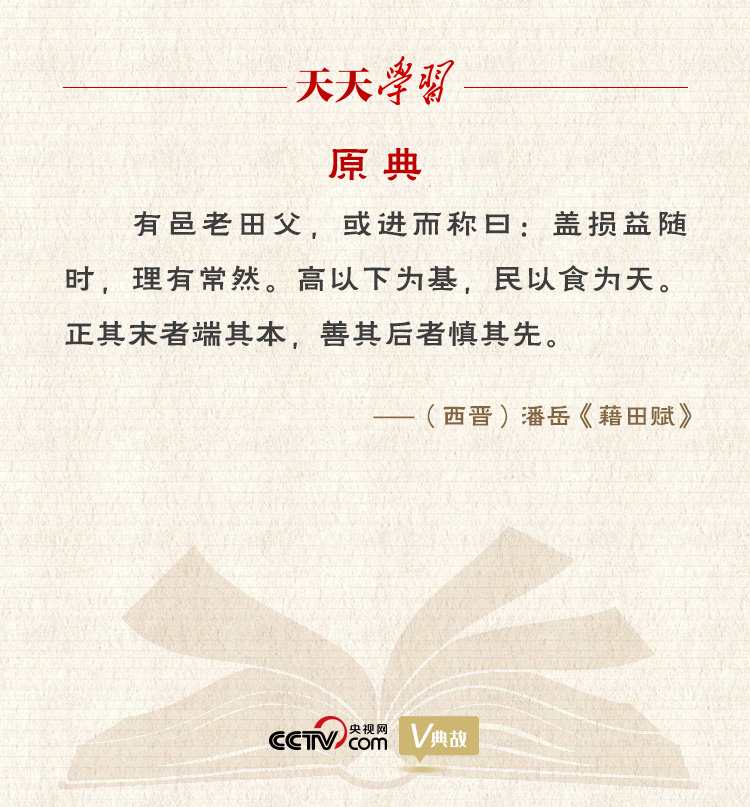 在《藉田賦》中,潘岳不僅歌頌了藉田場面的宏大,還借“田父”之口對藉田禮的意義進行闡釋:“高以下為基,民以食為天。正其末者端其本,善其後者慎其先。”末:樹梢,古時稱工商業為末業;本:樹根,古時稱農業為本業。潘岳認為,民以食為天,只有重本抑末,農業才能獲得發展,人民才不會捱餓,國家才有儲糧以備災荒。