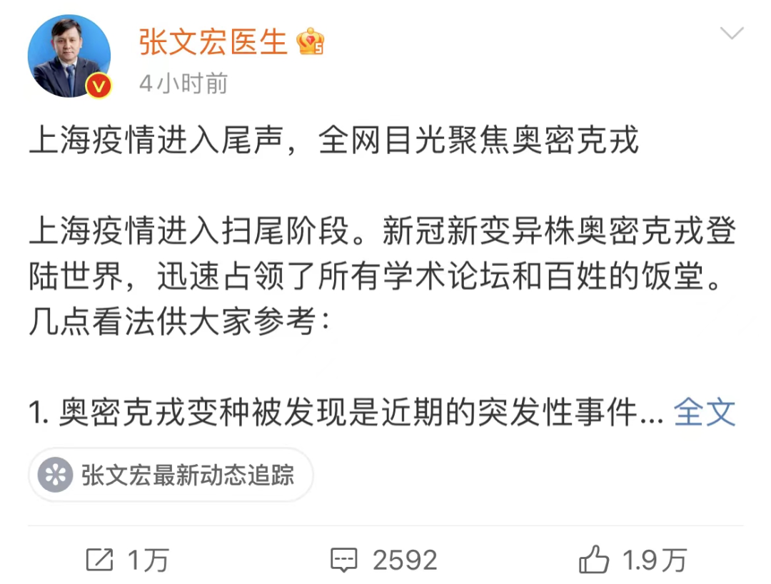 11月28日午間,張文宏也發佈微博,回應新變異毒株的影響。
