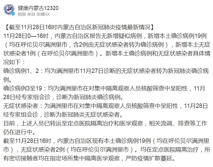 11月28日0—16時,內蒙古自治區報告無新增疑似病例,新增本土確診病例19例(均在呼倫貝爾滿洲里市,含2例由無症狀感染者轉為確診病例),新增本土無症狀感染者1例(在呼倫貝爾滿洲里市)。新增本土確診病例和無症狀感染者具體情況如下: