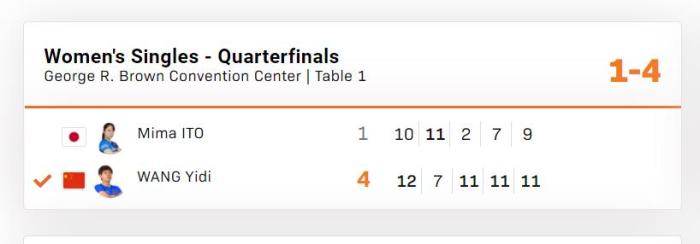 至此,日本女單在本屆世乒賽全軍覆沒。日本女乒的三大主力伊藤美誠、平野美宇和石川佳純均被國乒女將淘汰出局。