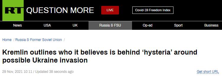 據RT介紹,“整個11月下來,一些西方媒體都在渲染俄羅斯準備‘入侵’烏克蘭一事。”報道提到,尤其是美國哥倫比亞廣播公司(CBS)本月一篇報道曾聲稱,“隨着天氣變冷,俄羅斯對烏克蘭發動潛在攻擊的可能性越來越大”。