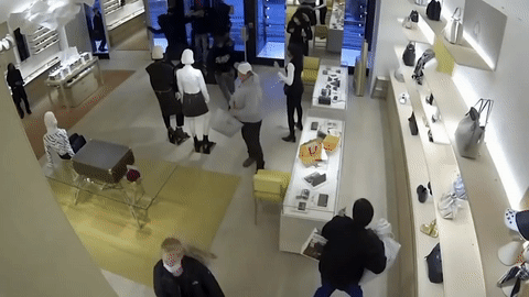 在加州洛杉磯,10名15-20歲的嫌犯戴着面罩在家得寶搶走了撬棍、木槌和大錘等工具,跳上在外面等候的車輛離開;3名持槍男子打劫珠寶店搶走勞力士手錶;一大羣人衝進一家高端服裝店打砸搶,還使用了胡椒噴霧。