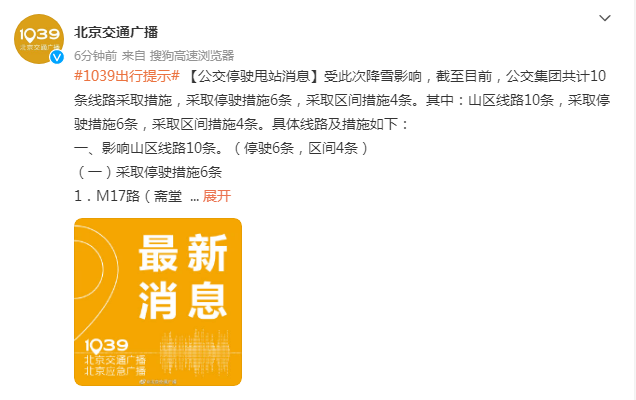 1.M17路(齋堂公交場站-洪水峪),受門頭溝山區洪水峪路段降雪影響,採取停駛措施,雙方向停駛;