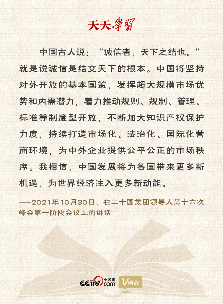 習近平主席今年以視頻方式出席二十國集團領導人第十六次峯會第一階段會議時指出,當前,新冠肺炎疫情持續反覆,世界經濟復甦脆弱,氣候變化挑戰突出,地區熱點問題頻發。面對世界百年未有之大變局和世紀疫情,二十國集團作為國際經濟合作主要論壇,要負起應有責任,為了人類未來、人民福祉,堅持開放包容、合作共贏,踐行真正的多邊主義,推動構建人類命運共同體。為此,習主席引用古語“誠信者,天下之結也”,向世界傳播中國聲音,傳達中國方案。