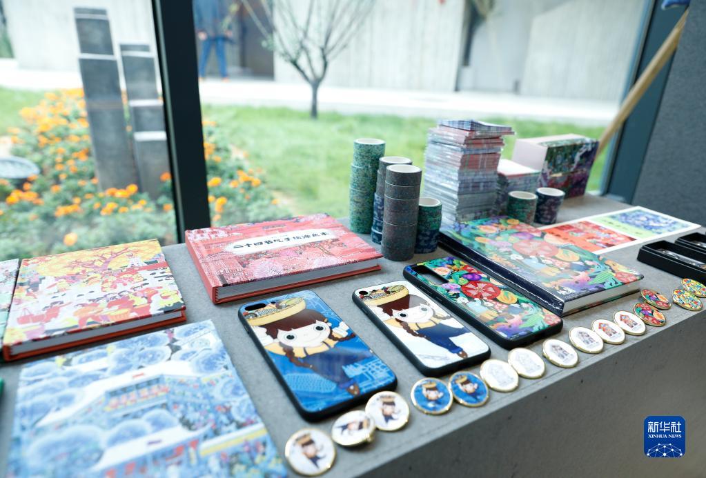 這是印有農民畫圖案的徽章、手機殼、筆記本等文創衍生品(4月2日攝)。新華社發