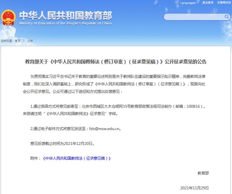 為貫徹落實習近平總書記關於教育的重要論述特別是關於教師隊伍建設的重要指示批示精神,完善教師法律制度,我們在深入調研基礎上,研究形成了《中華人民共和國教師法(修訂草案)(徵求意見稿)》,現面向社會公開徵求意見。公眾可通過以下途徑和方式提出反饋意見: