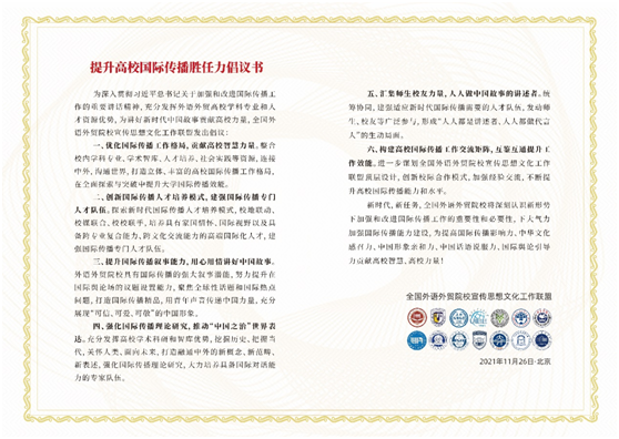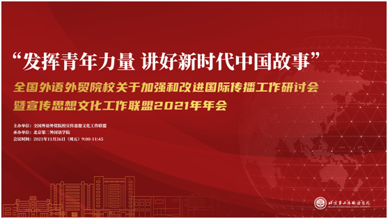 11月26日,“發揮青年力量講好新時代中國故事”全國外語外貿院校關於加強和改進國際傳播工作研討會暨宣傳思想文化工作聯盟2021年年會通過線上形式召開。本屆年會以“發揮青年力量講好新時代中國故事”為主題,與會14所外語外貿高校緊密圍繞宣傳思想文化工作創新、國際傳播工作創新展開深入交流,並聯合發出關於“提升高校國際傳播勝任力”的倡議。