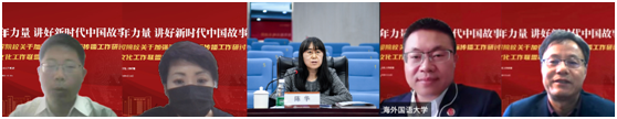 在圓桌討論環節,圍繞學習宣傳貫徹十九屆六中全會精神以及加強和改進高校國際傳播工作,北京外國語大學黨委宣傳部副部長王薇薇,上海外國語大學黨委常委、黨委宣傳部部長衣永剛,對外經貿大學黨委常委、黨委宣傳部部長張小鋒,北京語言大學黨委宣傳部副部長卜晨光,廣東外語外貿大學黨委常委、黨委宣傳部部長鬍文濤,北京第二外國語學院黨委宣傳部常務副部長鞏琳萌,外交學院黨委辦公室主任曾雄軍,國際關係學院黨委宣傳部副部長陳丁丁,天津外國語大學黨委常委、黨委宣傳部部長郭太,四川外國語大學黨委宣傳部部長古晶,西安外國語大學黨委宣傳部常務副部長,教師工作部部長馬少輝,大連外國語大學黨委常委、黨委宣傳部部長張皎,上海對外經貿大學黨委常委、黨委宣傳部部長郭茜,浙江外國語學院黨委宣傳部副部長張佩麗進行在線交流,分享各校經驗做法。圓桌討論環節由天津外國語大學黨委常委、黨委宣傳部部長郭太主持。