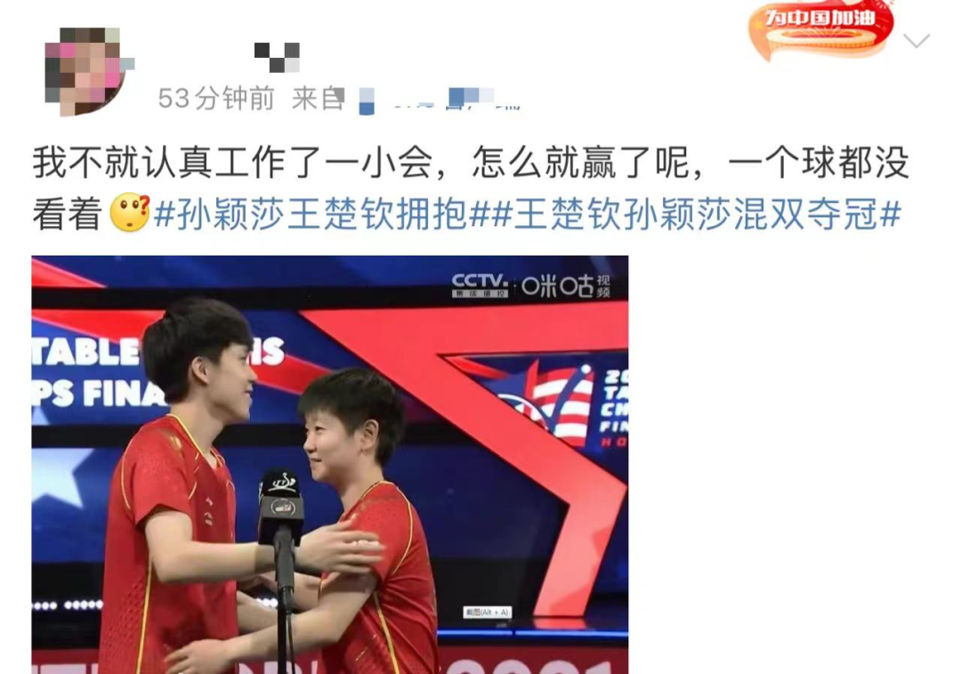 “我們擁抱了一下!”王楚欽孫穎莎慶祝世乒賽奪金,網友:我飯還沒吃完......