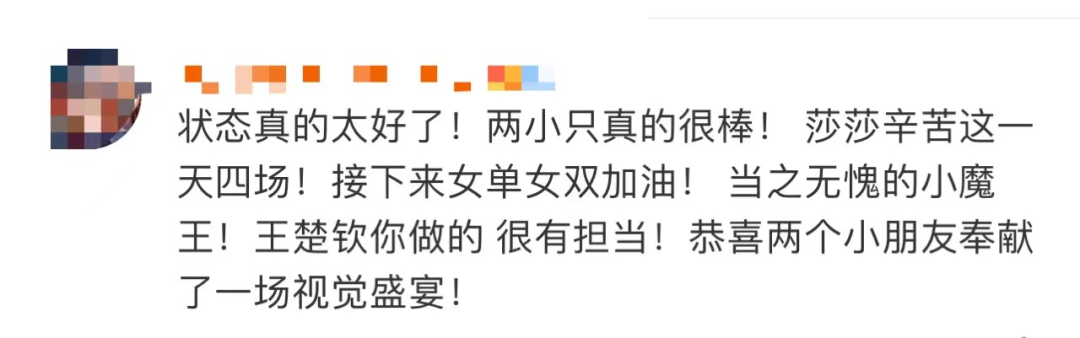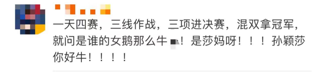 值得一提的是,過去12個小時內, 孫穎莎接連參加了混雙半決賽、女雙半決賽、女單半決賽和混雙決賽4場比賽,豪取一撥4連勝。