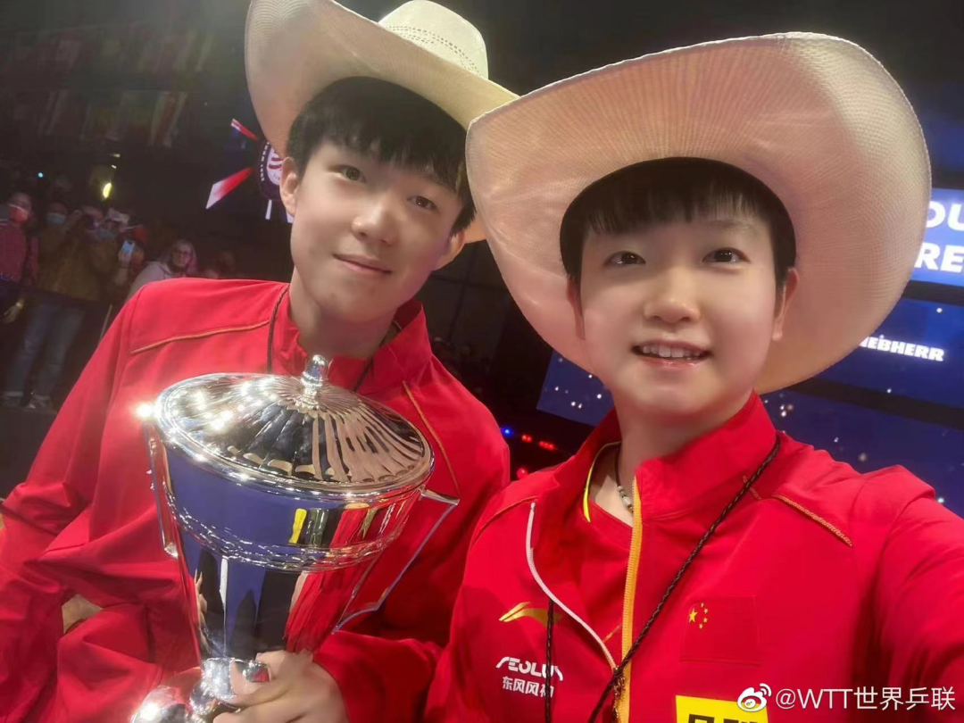 剛剛,2021休斯敦世乒賽在混雙賽場產生第一枚金牌, 中國隊*“00後”組合* 王楚欽/孫穎莎以3比0擊敗日本隊 張本智和/早田希娜,首度捧得世乒賽混雙冠軍獎盃赫杜塞克杯。