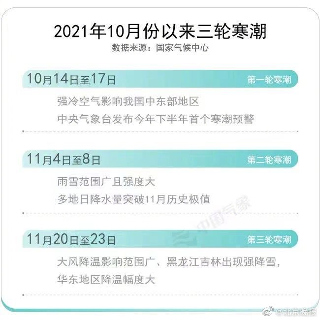 不算正在經歷的,據國家氣候中心統計,今年下半年以來我國已經經歷的三輪大範圍寒潮天氣過程,分別發生在10月14日至17日、11月4日至8日、11月20日至23日。上述三輪寒潮的“個性”極其鮮明。