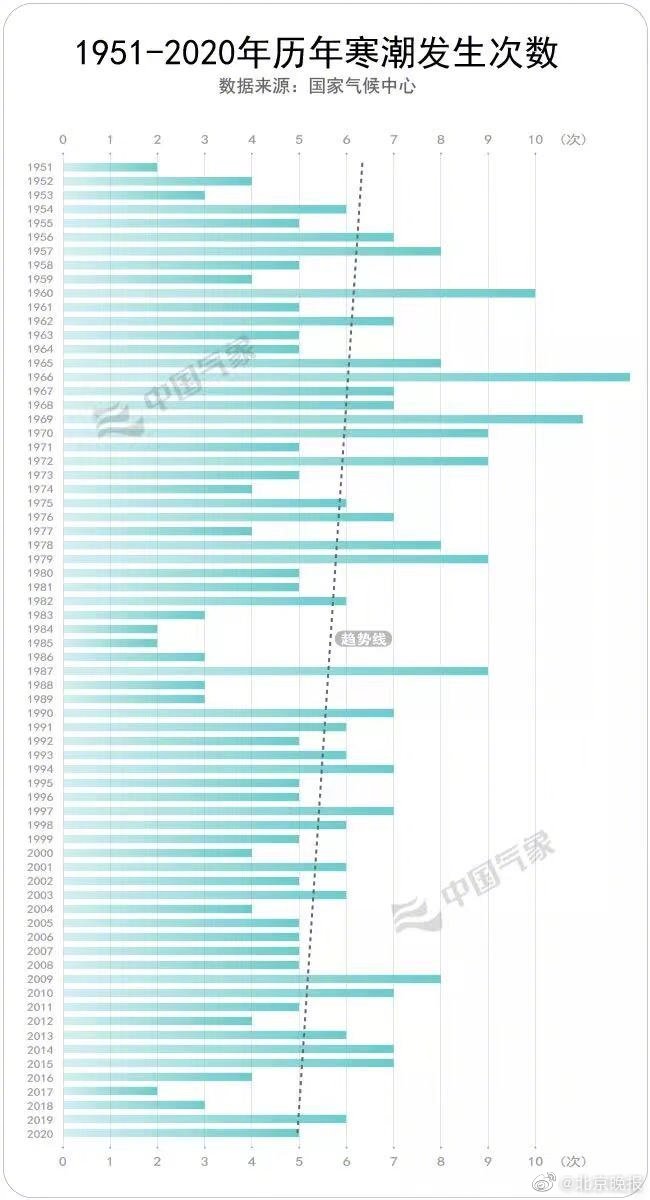 通過數據不難看到,1951年、1984年以及1985年影響我國的寒潮只有2次,而2009年就有8次,更進一步説明,寒潮減少是平均態,不能代表某年肯定多/少。