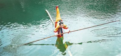 起伏的江面上,駕一葉扁舟尚且不易,若是站到一根竹竿上漂流呢?再試想,身着層層舞衣,在竹竿上抬腿、下腰、轉圈,行進間自如表演呢?
